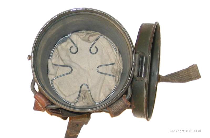 Below: the normal strap configuration on a gasmask cannister Also seen are the Verstärkungsschieber (reinforcement slides) which are shown here